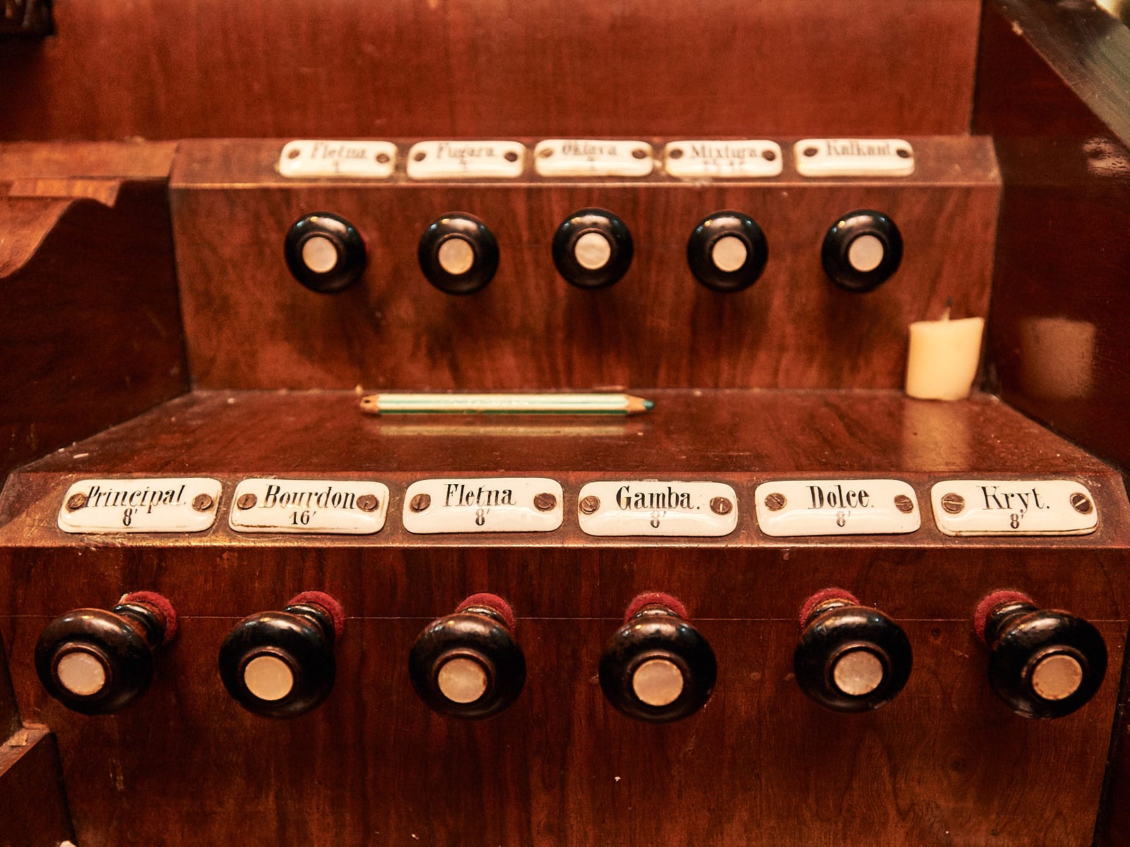 Bordun 16´, Principál 8´, Flétna 8´, Kryt 8´, Salicionál 8´, Gamba 8´, Oktáva 4´, Flétna trubicová 4´, Fugara 4´, Mixtura 2 2/3´