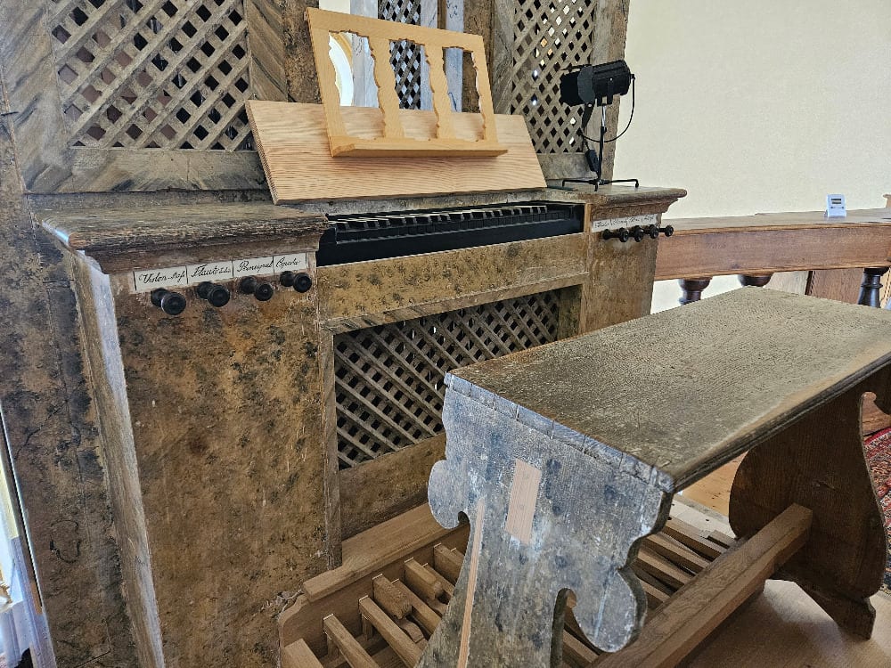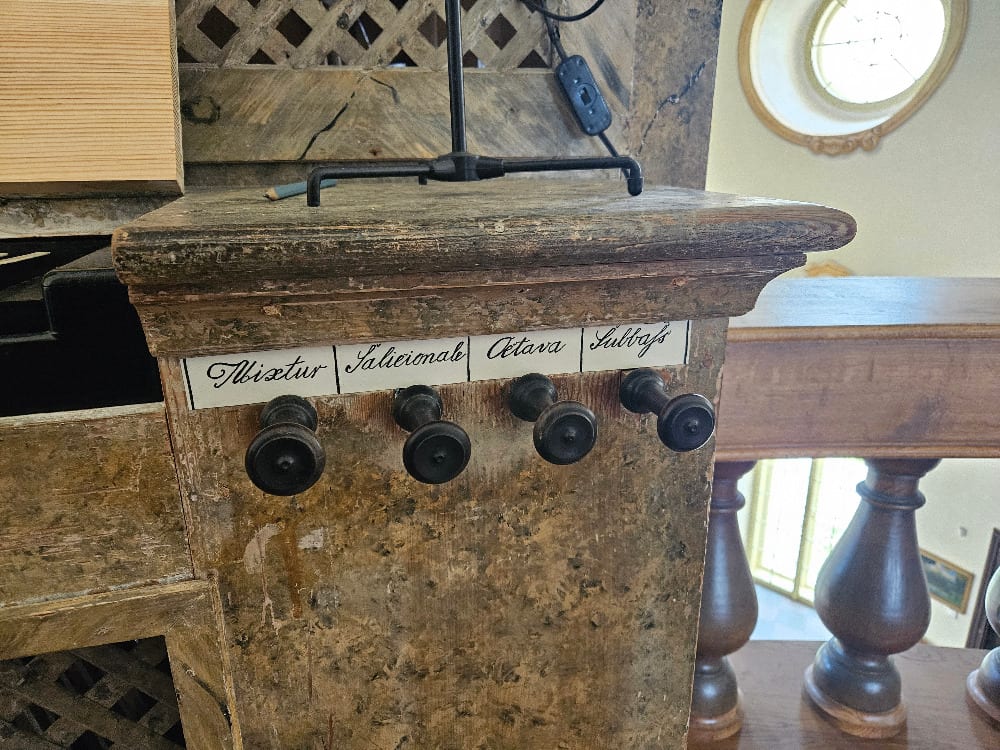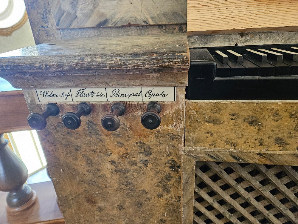 Varhany mají celkem 8 rejstříků (6 v manuálu a 2 v pedálu), výška ladění je 440 Hz při