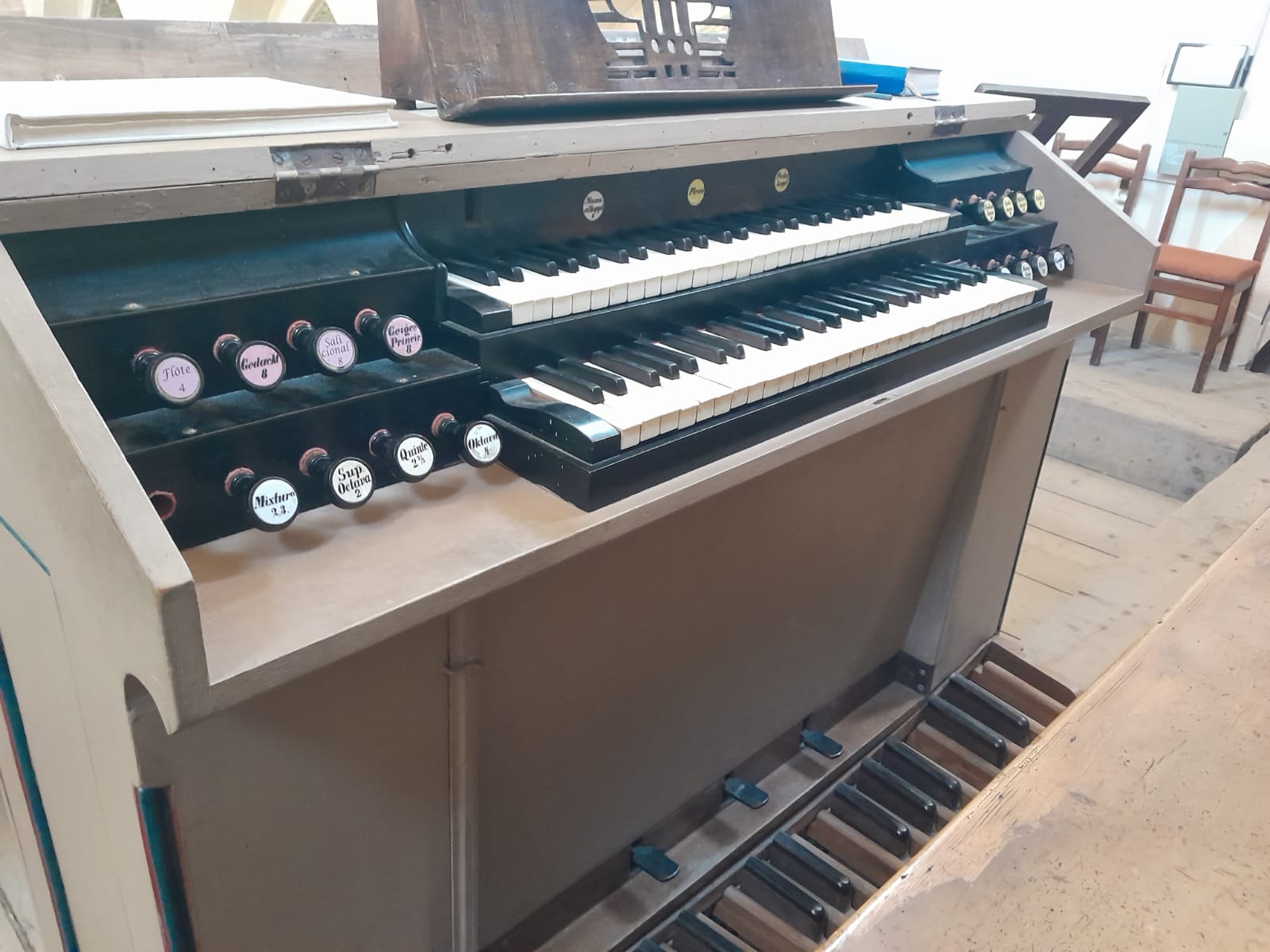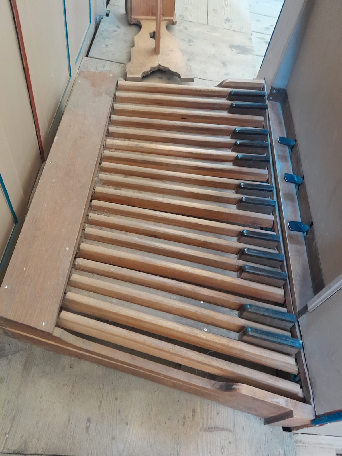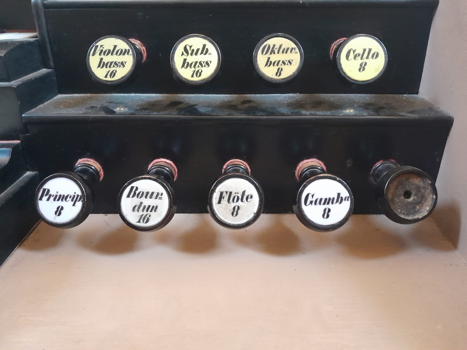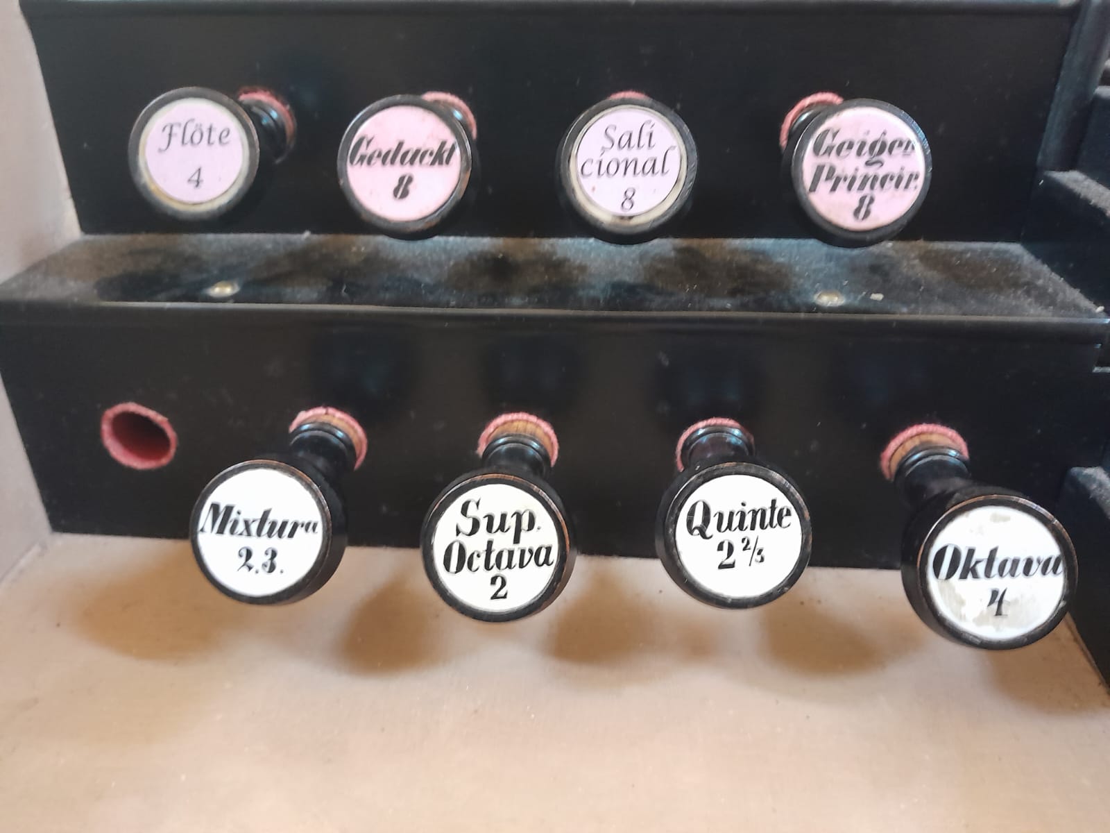 Bourdon 16´, Princip. 8´, Flöte 8´, Gamba 8´, ???, Oktava 4´, Quinte 2 2/3, Sup. Octava 2´, Mixtura 2.3.